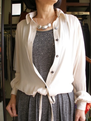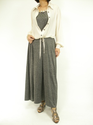 マキシワンピにはシャツを羽織るとカジュアルすぎません。シャツの裾はキュッと結ぶのがポイント!スタイリッシュ度70%、アクティブ度30%。