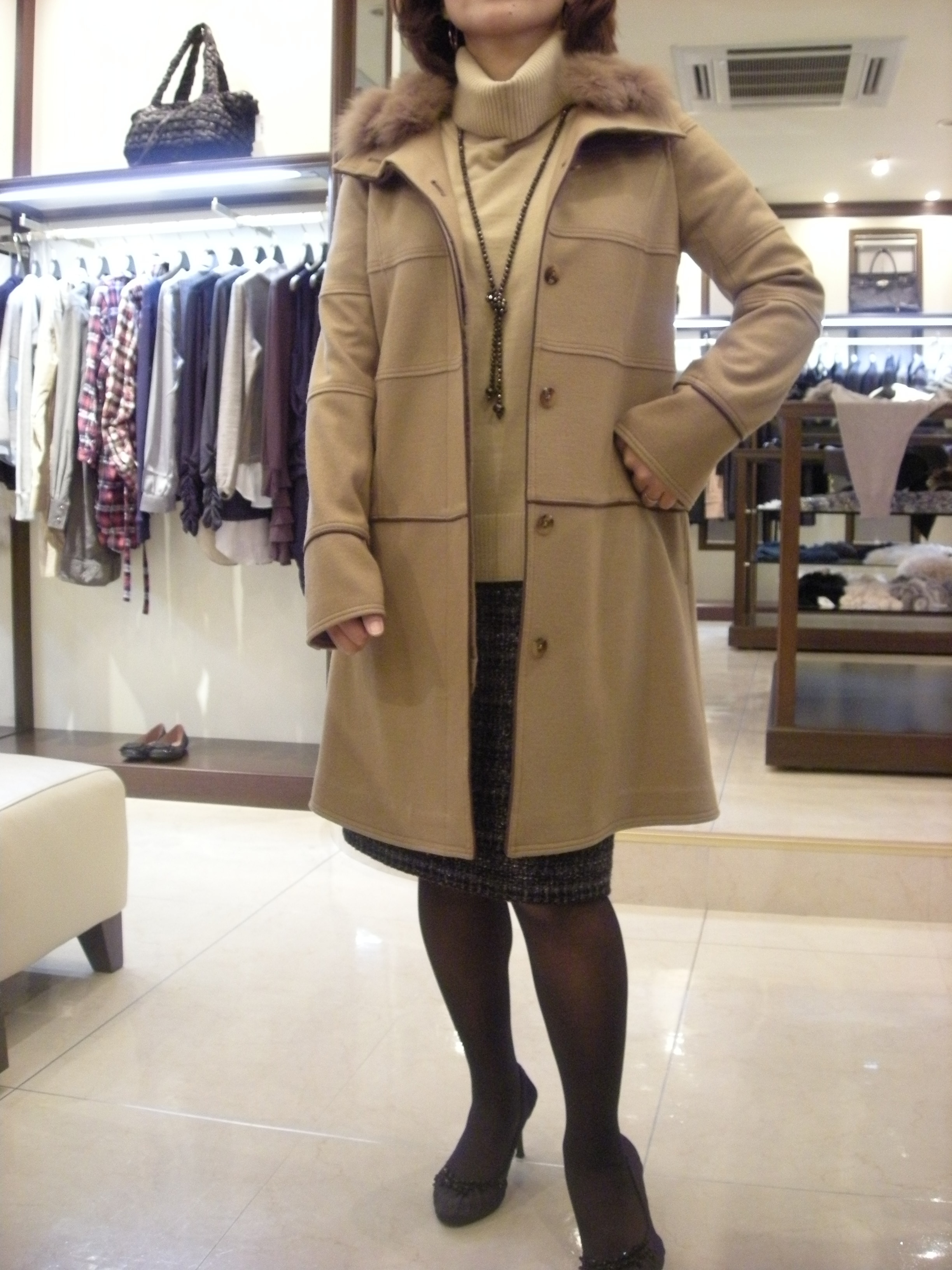 コートをあれこれご試着されました。お仕事を持ってみえるのでONのお洋服が多いですね。ご自分の似合う物を良くご存知ですのでいつも的確にチョイスされます。このベージュのコートもとってもお似合いですね!