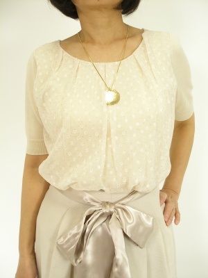 ベージュでまとめたコーディネートはリボンベルトとネックレスの艶感がポイントです!エレガンス度60%、フェミニン度40%。