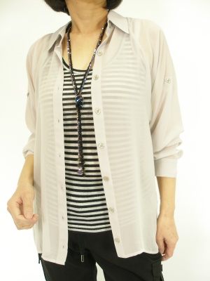 透け感のあるエレガントなシャツは黒を合わせてシャープに着こなして。個性多岐なバッグスタイルにも注目!スタイリッシュ度80%、エレガンス度20%。