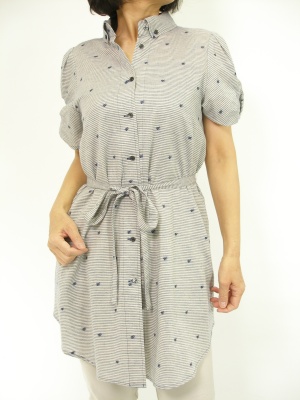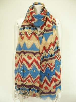 細かい柄のシャツチュニックには大柄のストールでメリハリをつけて!フェミニン度60%、アクティブ度40%。