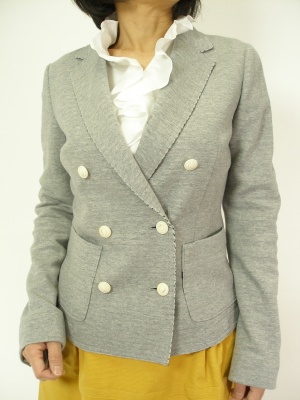 ダブルのジャケットからインナーのフリルをのぞかせると、キチンとしながらもソフトな印象に!エレガンス度80%、フェミニン度20%。