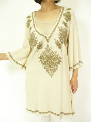 刺繍のチュニックにタッセルの付いたストール。エスニックアイテムは淡色コーディで上品に!スタイリッシュ度70%、アクティブ度30%。
