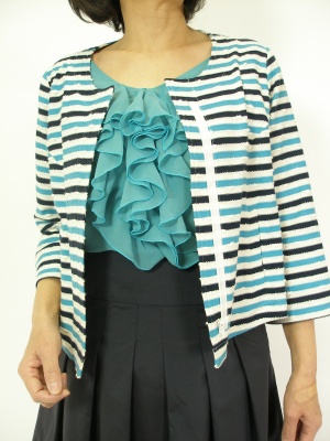 甘口なお出かけスタイルはブルー系で爽やかに。ジャケットもボーダーならカッチリしすぎません!エレガンス度60%、フェミニン度40%。