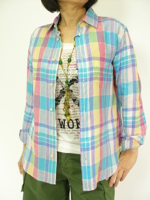 腰履きカーゴとチェックシャツでボーイズライクにまとめた休日スタイル。シャツのパステルカラーで可愛さもアピール!アクティブ度90%、フェミニン度10%。