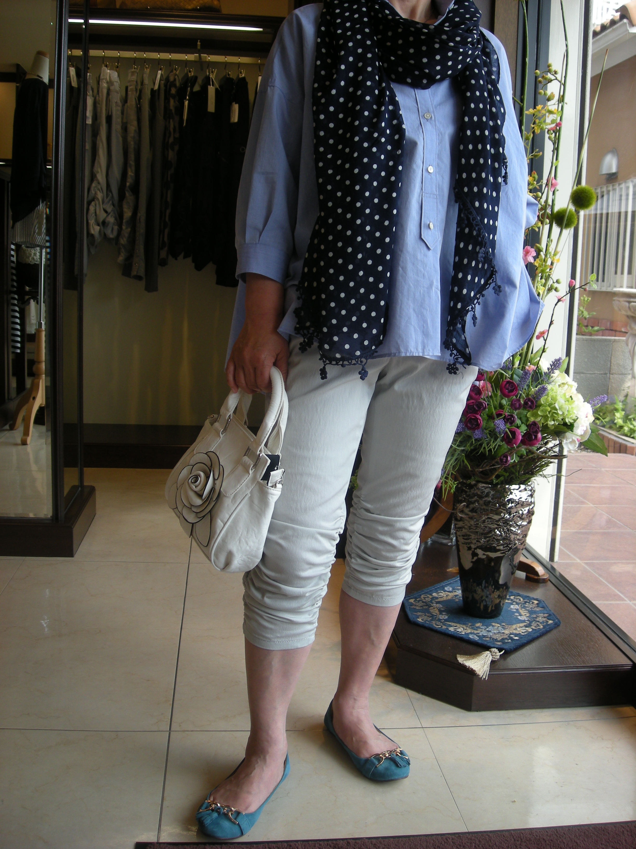 先日お買い上げ頂いたブルーのパンプスをはいてご来店。ブラウスもとっても気に入って下さいました。今日もお洒落のお話で盛り上がりました!
