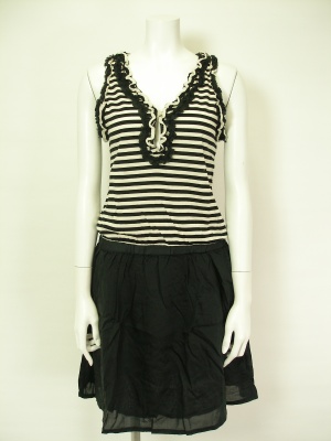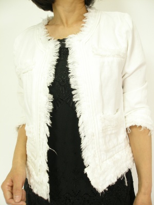 ノーカラージャケットとワンピースの上品コーディ。カジュアルな素材感なので堅苦しさがありません!エレガンス度60%、スタイリッシュ度40%。