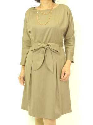 七分袖のワンピースはネックレスと小さめのバッグで少しキチンとした装いに!エレガンス度70%、フェミニン度30%。