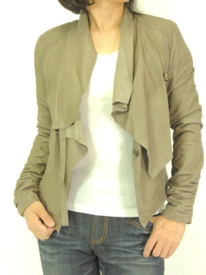 ワンピースにレザージャケットを合わせた辛口コーディネート。インパクトストールをサラリと垂らすとさらにクールな印象に!アクティブ度90%、エレガンス度10%。