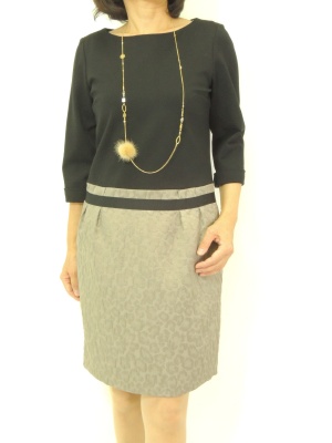 切り替えワンピのトップスが黒なので、ファー付きネックレスがとても映えます!エレガンス度80%、スタイリッシュ度20%。