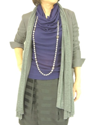 ストールを垂らしたようなジャケットが甘口スカートをクールに見せます!スタイリッシュ度70%、アクティブ度20%。