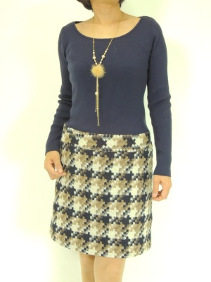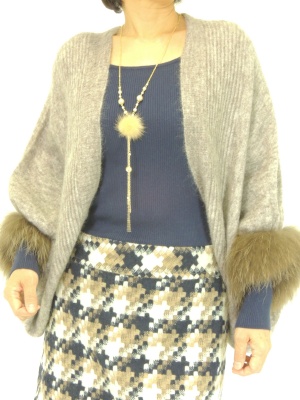トップスがリブニットのワンピースは重ね着しても、まとまりやすい。ゆったりカーディもファー付きならリッチな雰囲気です!エレガンス度80%、スタイリッシュ度20%。