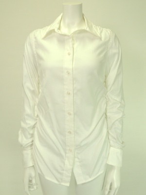 リラックスした着こなしには、キリリとした白シャツと華やかなストールでアクセントを!スタイリッシュ度90%、アクティブ度10%。