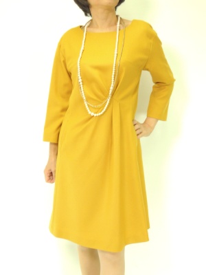 冬に映えるマスタードイエローのワンピース。カシミヤの上質なストールをさらりと羽織って!エレガンス度90%、スタイリッシュ度10%。