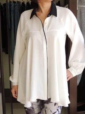柔らかなAラインのブラウスにはすっきりとしたレギパンを。モノトーンでまとめたシックだけど個性的なスタイルです!スタイリッシュ度90%、エレガンス度10%。