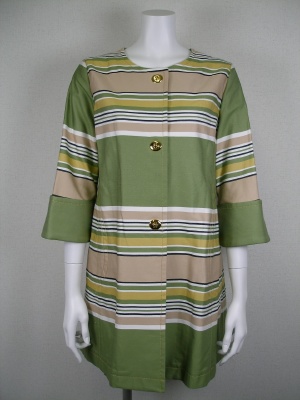 レトロなマルチボーダーのコートが主役のコーディネート。インナーとスカートは色みを抑えてコートを目立たせて!フェミニン度90%、スタイリッシュ度10%。