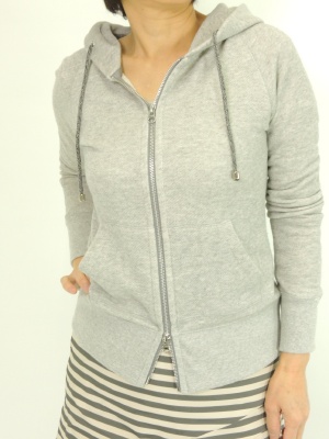 スポーティなパーカもコンパクトなタイプならフェミニンスタイルのハズシに使えます!フェミニン度70%、アクティブ度30%。