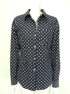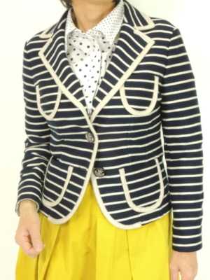 ボーダー×ドットの柄物コーデも紺×白ならスッキリまとまる。スカートのイエローを指し色にしたフェミニンなマリンルック!フェミニン度60%、スタイリッシュ度40%。
