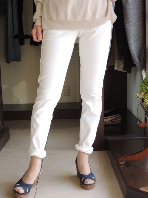 ビッグサイズのシャツはタイトな白パンツでさらりと着こなしたい。ラメタンクのちら見せで女らしさも忘れずに!アクティブ度80%、スタイリッシュ度20%。