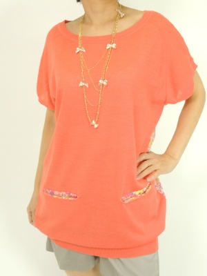 キレイ色のゆったりニットはポケットと後ろのリバティー柄に注目。ショートパンツでシンプルに着こなして!フェミニン度70%、アクティブ度30%。
