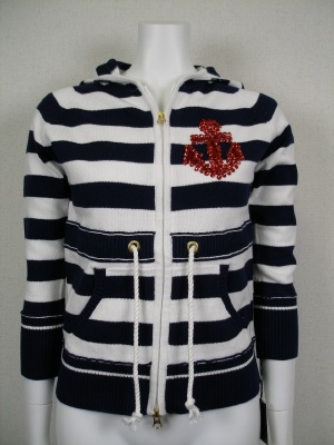 マリンなニットパーカにあえてカーゴを合わせてカッコよく。優等生すぎないコーディネートはお友達の中でさりげなく目立つはず!