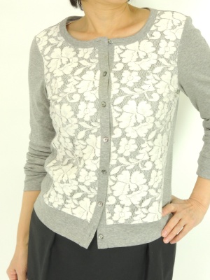 レースを使った上品なカーディガンは着やすいカットソー素材。シックなスカートを合わせると、ちょっとお出かけにも!フェミニン度60%、エレガンス度40%。