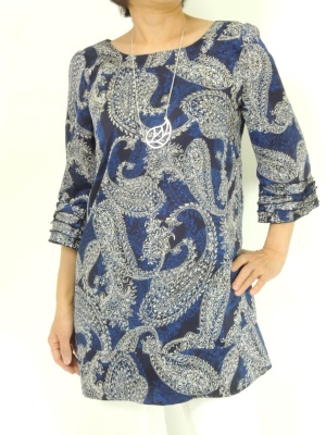 シックなペイズリー柄のチュニックはちょっとしたお出かけにもピッタリ。白パンツとかごバックで季節感を出して!フェミニン度60%、スタイリッシュ度40%。