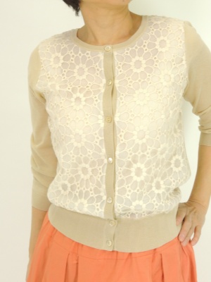 レースが上品なカーディガンはボタンを閉じて一枚で着てもお洒落。ブライトカラーのスカートも優しい印象になります!フェミニン度70%、エレガンス度30%。