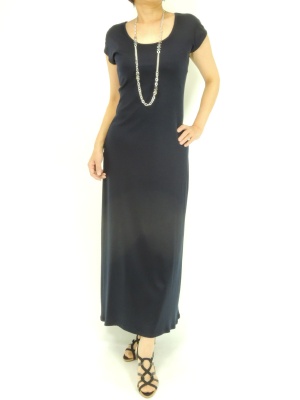 シンプルなマキシワンピはボレロタイプのカーデとロングネックレスを合わせればバランスよくまとまります!エレガンス度60%、スタイリッシュ度40%。