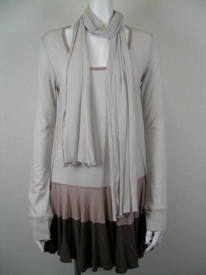 | スタイリッシュ・モダン (丈長のシャツは羽織として着こなす)襟無しの長袖シャツは丈長なのでパンツの上に羽織として合わせると重宝です。温度調整のしにくいこの季節にぴったりな一枚。 | |