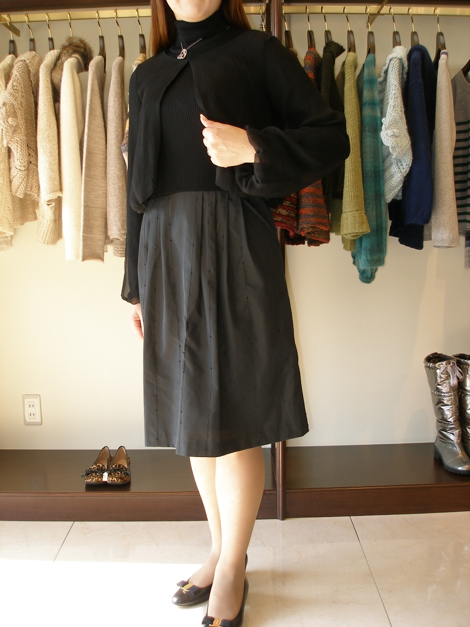 お買い上げの黒のワンピースとカットソー。ボレロで上手に合わせてご来店されたので、思わず「撮らせて!」とお願いしました。バッチリですよ!