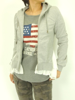 フリルの付いたパーカやギャザー入りの迷彩パンツなら、カジュアルだけどボーイッシュじゃない可愛いスタイルに!アクティブ度90%、フェミニン度10%。