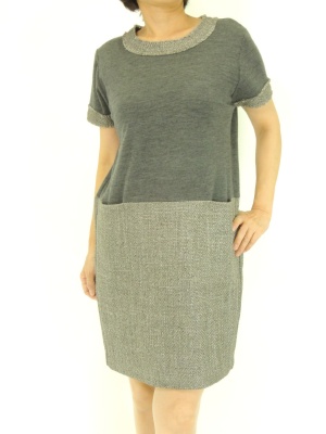 ゆとりあるコクーンワンピはジャケットを羽織ればきちんとした印象に!エレガンス度70%、フェミニン度30%。