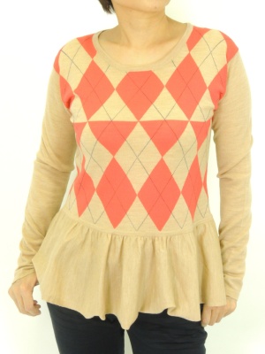 上品なアーガイルニットをチノパンとスニーカーでカジュアルダウン。パンツは細身を、スニーカーはヒールのあるタイプを選んで!アクティブ度70%、フェミニン度30%。