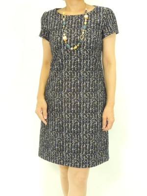 シンプルシルエットのワンピースは小物使いで差をつけたい。ベルトと大ぶりネックレスで引き締まった印象に!エレガンス度80%、スタイリッシュ度20%。