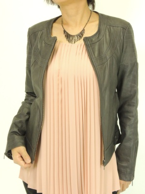 レザージャケットを辛口に着こなす時は、どこか一か所女らしいアイテムを投入して!スタイリッシュ度80%、フェミニン度20%。