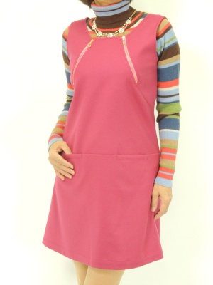 ピンクのノースリーブワンピとマルチボーダーで60年代みたいな着こなしもおススメ!フェミニン度80%、スタイリッシュ度20%。