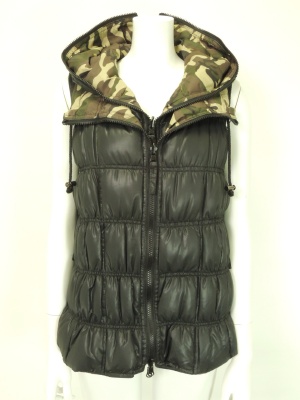 お袖が特徴的なワンピースにはダウンベストを合わせて。迷彩柄とクラッチバッグのグリーンがアクセントに!フェミニン度70%、アクティブ度30%。