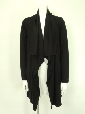 カーディガンのドレープに添うようにストールを垂らして、縦のラインを強調したコーディネート。羽織り物はロングコートがバランス良い!スタイリッシュ度80%、エレガンス度20%。