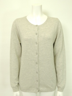 クールネックカーデはボタンをきちんと留めると清楚な印象。ふんわりスカートに合わせてフェミニンに!フェミニン度80%、エレガンス度20%。