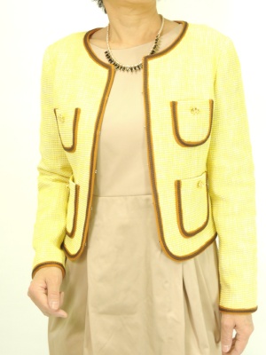 ハリのあるノースリーブワンピにはジャケットがよく映えます。イエロージャケットなら春らしい印象に!エレガンス度70%、フェミニン度30%。