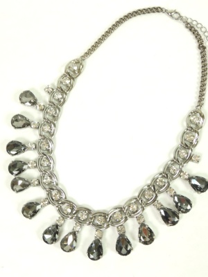 紺×白で清楚にまとめたい時は、個性的な小物を合わせたい。ビジューネックレスとクラッチバックで旬の表情に!エレガンス度80%、スタイリッシュ度20%。