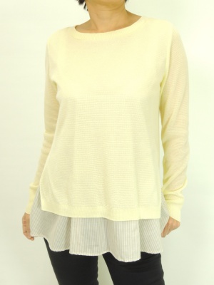 重ね着デザインのニットはネイビーのパンツでスッキリ着こなして。イエローとグリーンの色合いが春らしい!アクティブ度80%、フェミニン度20%