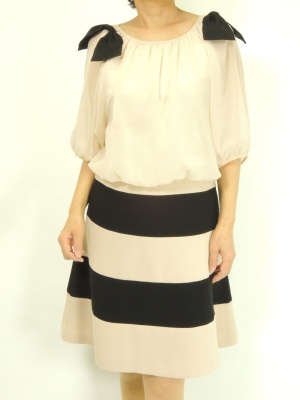 リボンが可愛いドッキングワンピはサラリと一枚で。ボリュームネックレスとクラッチバックでスパイスを効かせて!エレガンス度80%、スタイリッシュ度20%。
