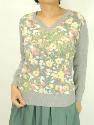 お花のプリントが春らしいニット。ピンクやブルーグリーンを合わせて、とことん春を満喫したい!フェミニン度100%。