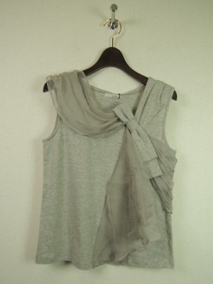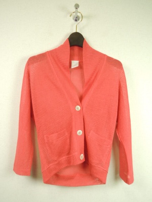 大きなリボンのカットソーも同系色だとインパクトは抑えられて上品にまとまります。ピンク系のカーデの色で華やかなコントラストをつけました!エレガンス度70%、フェミニン度30%。