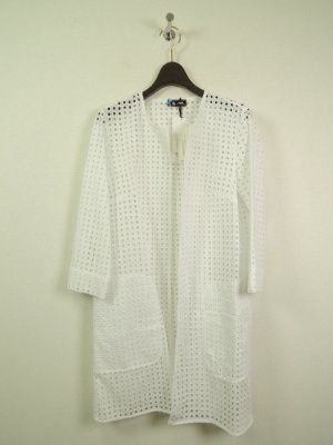 軽くて涼しげなカットワークレースのサマーコート。白のパンツに羽織るだけでオシャレ度がアップ!スタイリッシュ度70%、エレガンス度30%。