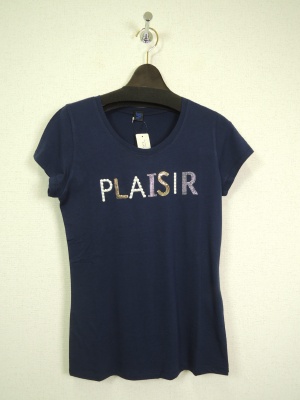 ビジュー使いのロゴが素敵なカットソー。コードレーンのパンツで涼しげに!アクティブ度60%、スタイリッシュ度40%。