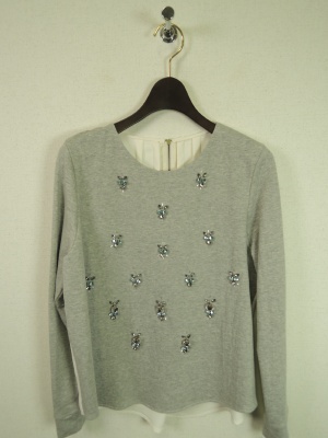 ビジュー使いのスエットカットソーは背中が別布切り替えで技ありの一枚。流行の迷彩パンツと合わせてみました!アクティブ度70%、スタイリッシュ度30%。