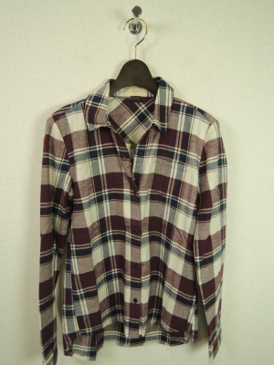 秋の気分を盛り上げるボルドーのコーディネート。活用度大のチェックのネルシャツにサーキュラースカート、肩にかけたカーデもオシャレですよ!フェミニン度80%、エレガンス度20%。